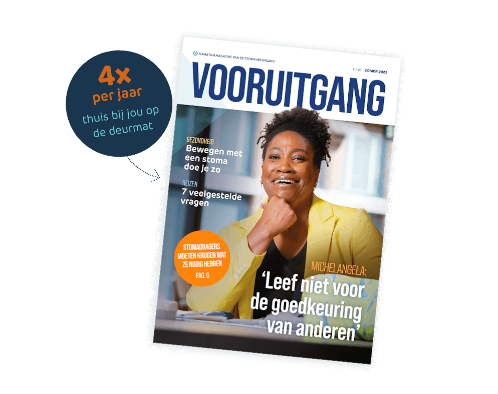 Vooruitgang is het magazine van de Stomavereniging. Dit blad staat vol interessante artikelen voor mensen met een colo-, ileo- of urinestoma of pouch. Het blad is ook interessant voor mensen die nog een stoma gaan krijgen of voor partners, familieleden en naasten. Er staan veel nuttige tips, interviews en reportages in. Word lid van de Stomavereniging en ontvang het magazine Vooruitgang 4x per jaar thuis bij jou op de deurmat.